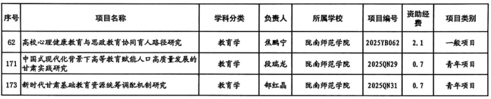 近日,甘肃省2025年度哲学社会科学规划项目立项结果正式公布。我校教师申报的三项课题成功获批,其中包括一般项目一项、青年项目两项,均为教育学学科领域,充分展现了我校在教育学科研领域的扎实积累与创新活力。