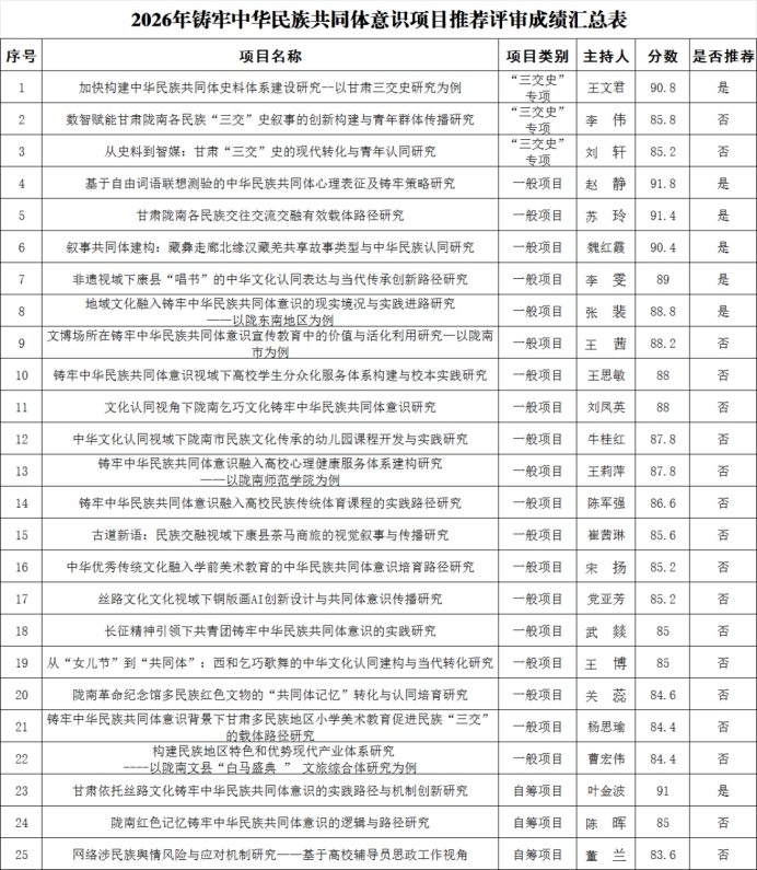 根据甘肃省民族事务委员会《关于申报2026年度铸牢中华民族共同体意识研究项目的通知》(甘民委发[2026]13号)文件精神,我校共申报25项,其中自筹项目3项(推荐1项)、“三交史”专项3项(推荐1项)、一般项目19项(推荐5项)。我校推荐限额共7项,经校内专家现场评审,现将拟推荐结果公示如下:
